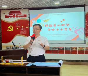 課堂后,姑嫂樹社區(qū)黨委書記周順生與“愛心花朵”教育服務中心的向老師代表愛心機構(gòu)和受助的困難家庭感謝武漢市政院對愛心事業(yè)的關注、對愛心機構(gòu)的所有困難家庭孩子的關愛,向武漢市政院敬贈錦旗,對武漢市政院的社會責任感和家國情懷、擔當精神表達敬意。