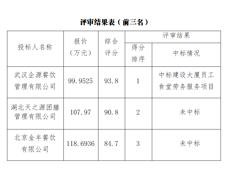? ? 經(jīng)評(píng)審,綜合評(píng)分排名第一為武漢企源餐飲管理有限公司,報(bào)價(jià)為99.9525萬元/年,綜合評(píng)分為93.8分,中標(biāo)武漢市政工程設(shè)計(jì)研究院有限責(zé)任公司建設(shè)大廈員工食堂勞務(wù)服務(wù)項(xiàng)目。