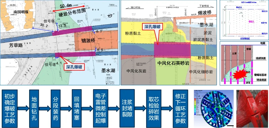 獲獎項目《地鐵隧道穿越極硬巖的新方法研究》是依托于武漢地鐵12號線港口村站至丁家咀站區(qū)間隧道工程。本項目存在隧道水下穿越強度高達251MPa極硬巖的復雜地質和周邊有橋梁、建筑等敏感環(huán)境兩大難題,實驗團隊歷經(jīng)近兩年的方案研究和工程實踐,創(chuàng)新性地提出了解決方案:采用控制爆破技術對極硬巖進行預處理,有效降低盾構機掘進的難度,同時在爆破過程中采取相應的減隔震技術,保障周邊橋梁、房屋和市政管線等建構筑物的安全。這一新技術極大地降低盾構機掘進通過極硬巖的難度,提高了施工效率,大幅減少了工程成本,實現(xiàn)了良好的社會和經(jīng)濟效益。