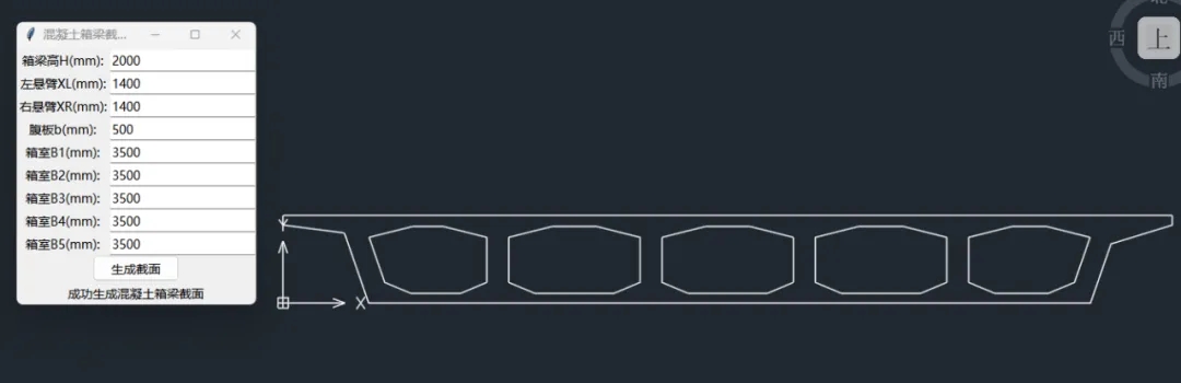 ? ? 武漢市政院實踐了多模態(tài)技術融合路徑——依托DeepSeek大模型深度工程語義理解與智能代碼生成框架,將混凝土箱梁截面的幾何參數(shù)標準、CAD二次開發(fā)規(guī)范等專業(yè)知識注入大模型認知體系,使其生成代碼框架。經過多輪調試,開發(fā)出參數(shù)化生成混凝土箱梁截面的小插件,能夠實現(xiàn)箱梁高度、懸臂長度、腹板寬度、箱室寬度等參數(shù)的設定,并配備可視化界面。