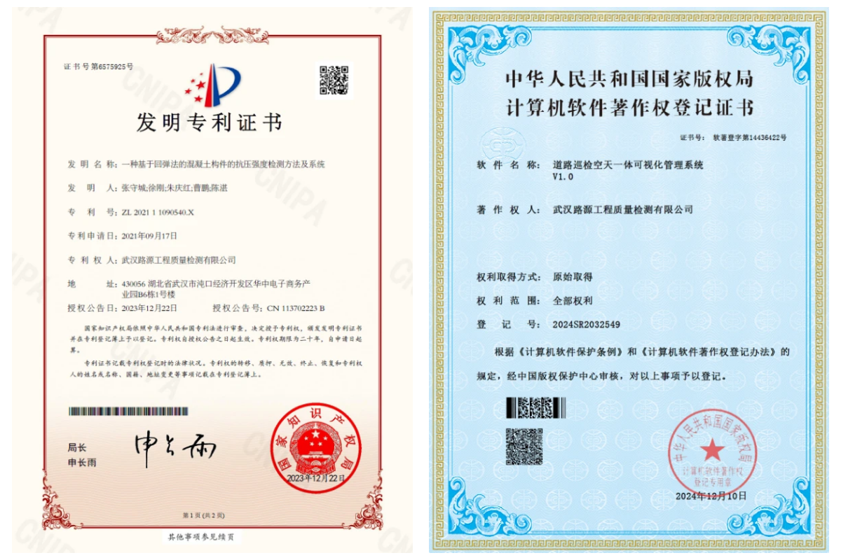 截至目前,已獲得知識(shí)產(chǎn)權(quán)授權(quán)共計(jì)47項(xiàng),其中發(fā)明專利授權(quán)2項(xiàng),實(shí)用新型專利17項(xiàng),軟件著作權(quán)28項(xiàng)。此外,路源檢測公司還積極參與行業(yè)標(biāo)準(zhǔn)的制定,參編市級(jí)標(biāo)準(zhǔn)規(guī)范共計(jì)3項(xiàng)。