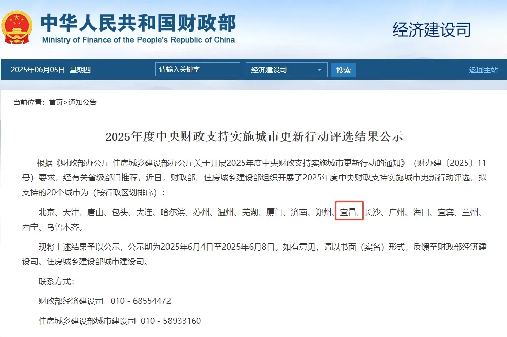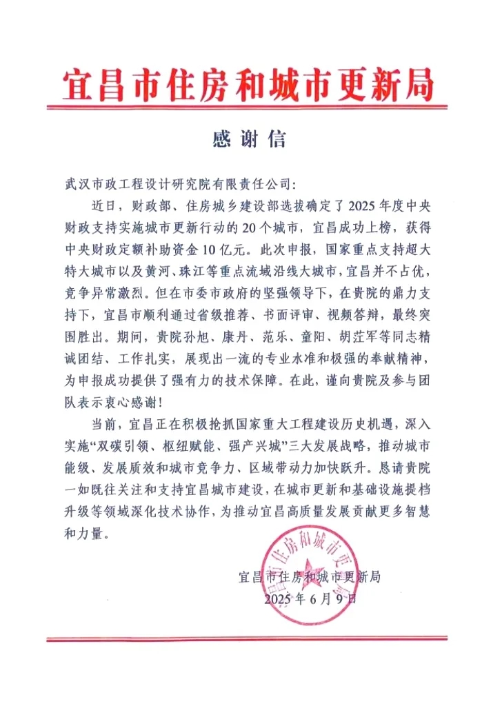 2025年6月4日,國(guó)家財(cái)政部經(jīng)濟(jì)建設(shè)司與住房城鄉(xiāng)建設(shè)部城市建設(shè)司聯(lián)合發(fā)布《2025年度中央財(cái)政支持實(shí)施城市更新行動(dòng)評(píng)選結(jié)果公示》,湖北省宜昌市成功入圍。武漢市政院作為唯一技術(shù)支持單位助力宜昌成功入選國(guó)家支持城市名單,充分彰顯了公司作為城鄉(xiāng)建設(shè)運(yùn)營(yíng)全過程咨詢智庫(kù)的卓越技術(shù)實(shí)力。