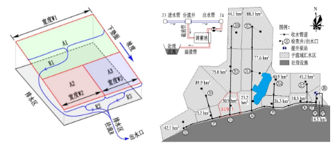 地塊產流原理圖(左)和排水管網概化圖(右)