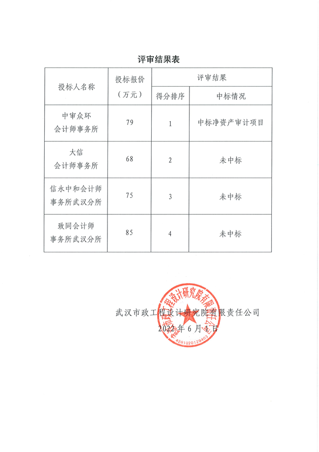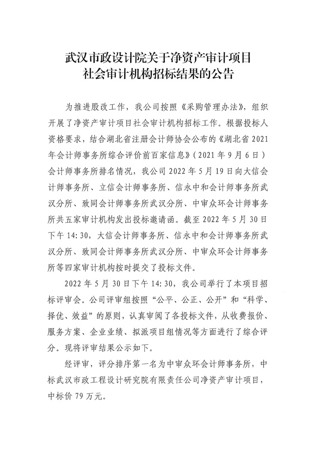 武漢市政設(shè)計院關(guān)于凈資產(chǎn)審計項目社會審計機構(gòu)招標(biāo)結(jié)果的公告