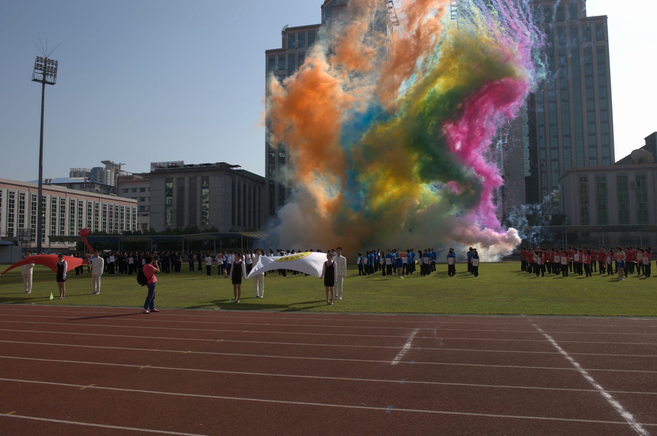 ??? 上午九點(diǎn),開幕式正式開始。在激昂的運(yùn)動(dòng)員進(jìn)行曲中,國旗方陣和會(huì)旗方陣先后從主席臺(tái)前經(jīng)過,在他們的引導(dǎo)下,四支代表隊(duì)的運(yùn)動(dòng)員方陣依次入場,精神抖擻,步伐矯健,展示出了蓬勃向上的精神風(fēng)貌。