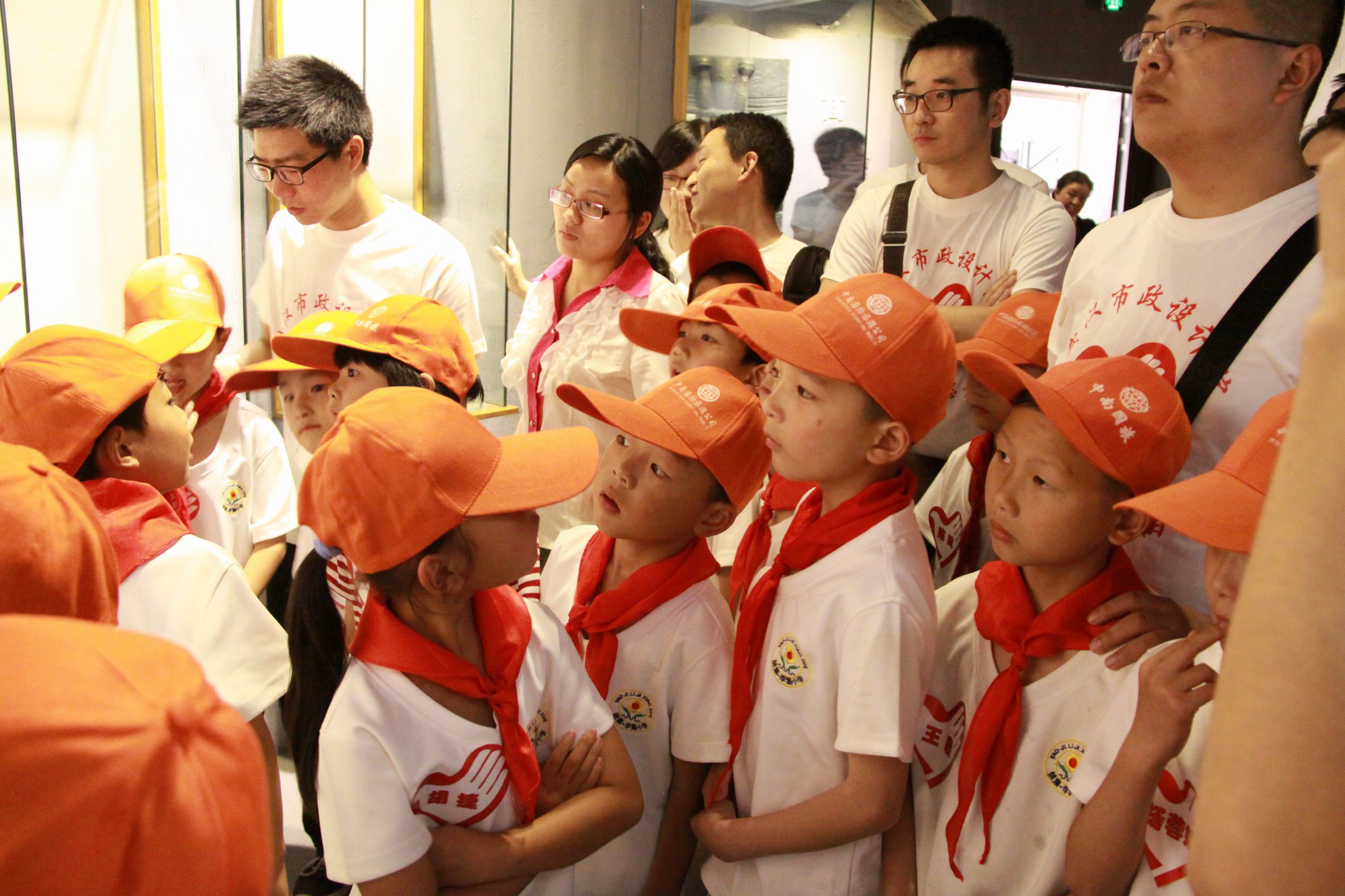 ??? 為了保證本次活動的順利進(jìn)行,公司安排了二十名志愿者與學(xué)生們一對一結(jié)對而行。上午十點(diǎn),當(dāng)滿載學(xué)生的車輛緩緩駛進(jìn)活動的第一站——武漢市博物館時,早已等候在那里的志愿者們用掌聲歡迎遠(yuǎn)道而來的小客人,并與自己結(jié)對的學(xué)生手牽手走入博物館參觀。學(xué)生們跟隨導(dǎo)游的講解,了解了武漢由發(fā)祥到發(fā)展,到今天取得的成就。部分古代出土的器物吸引住了他們的目光,他們有的圍在導(dǎo)游周圍問這問那,有的拉著結(jié)對的哥哥姐姐合影拍照。