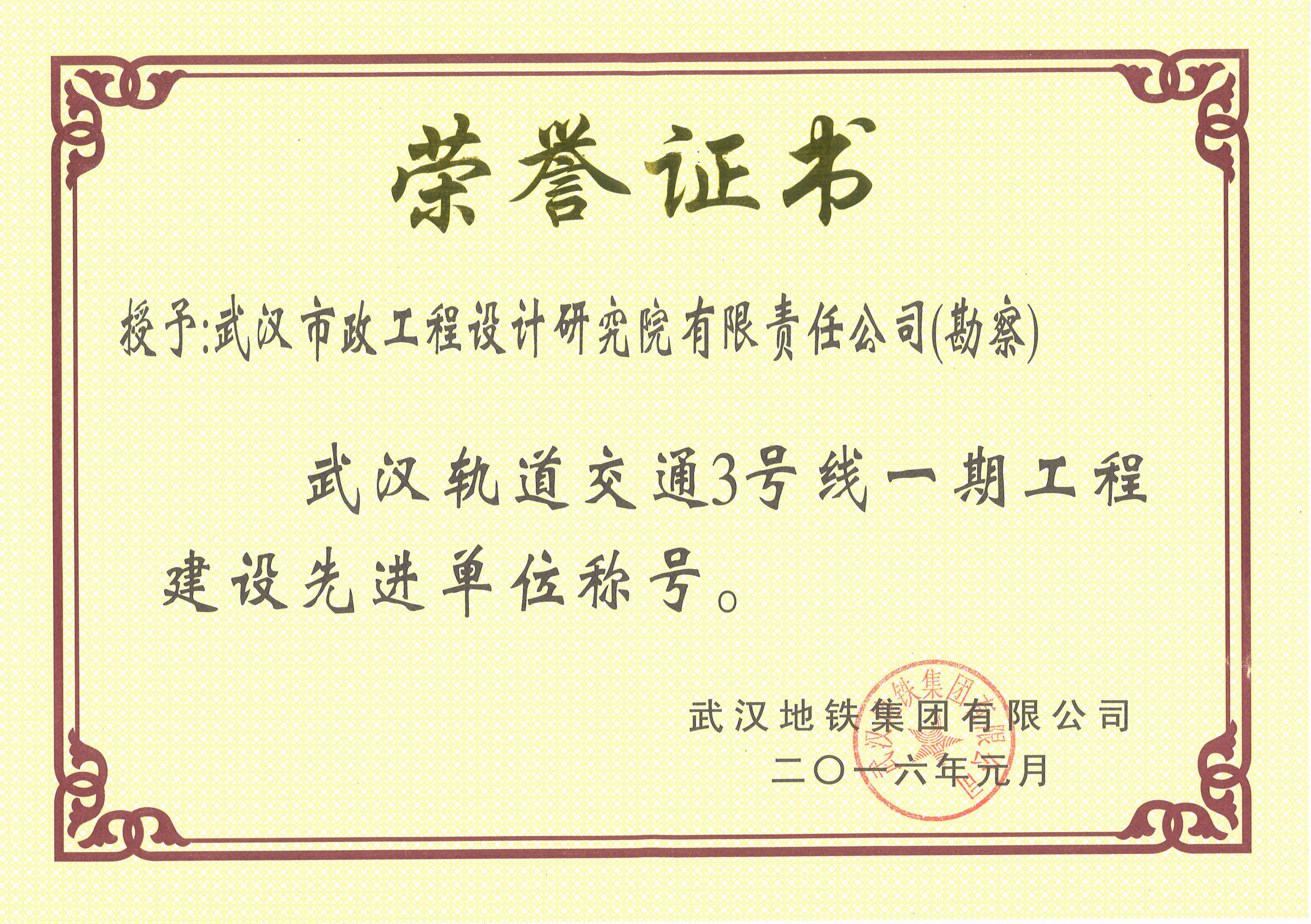 ??? 近日,武漢地鐵集團有限公司頒發(fā)文件,表彰一批在武漢軌道交通三號線一期工程建設中表現優(yōu)異的先進單位。公司由于參與并圓滿完成了三號線一期工程的勘察及部分站點和區(qū)間的設計工作,榮獲“先進單位”榮譽稱號。