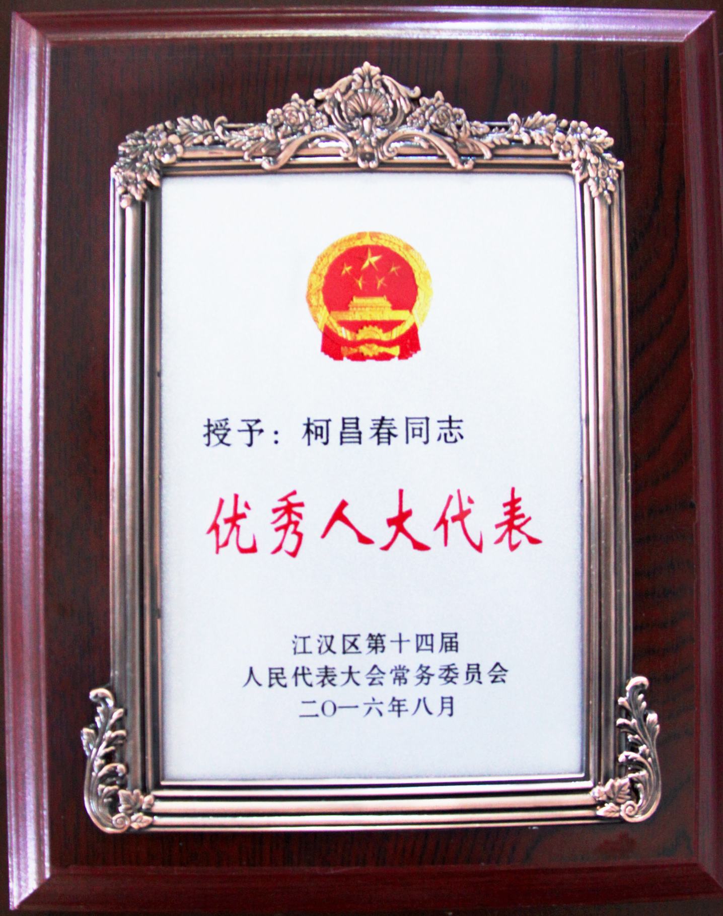 ??? 近日,一則喜報(bào)從江漢區(qū)人大傳來(lái),公司董事長(zhǎng)柯昌春同志在擔(dān)任江漢區(qū)人大代表期間積極為江漢區(qū)的建設(shè)和發(fā)展建言獻(xiàn)策,被江漢區(qū)人大授予“優(yōu)秀人大代表”榮譽(yù)稱(chēng)號(hào)。