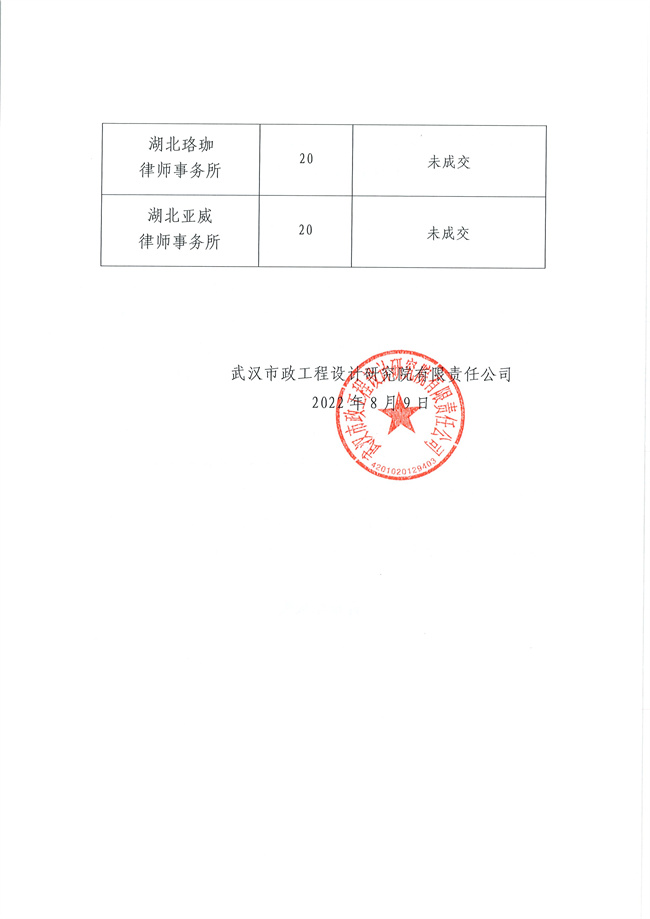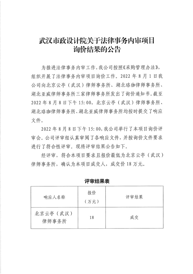 武漢市政設計院關于法律事務內(nèi)審項目詢價結果的公告